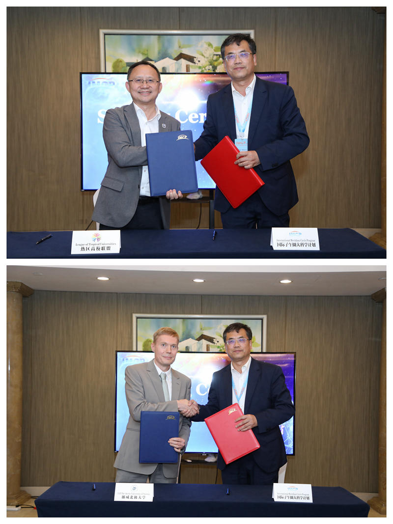 闭幕式上,“热带高校联盟”发起单位海南大学代表骆清铭校长与中国科学院国家空间科学中心王赤主任共同签署了国际子午圈大科学计划合作协议,进一步加强双方在赤道及低纬地区的探测能力建设、科学研究和人才培养。同时,王赤主任还与挪威北极大学(UiT)的 Juha Vierinen 教授签署了相关合作协议,推动国际子午圈计划在全球范围内的协作发展。